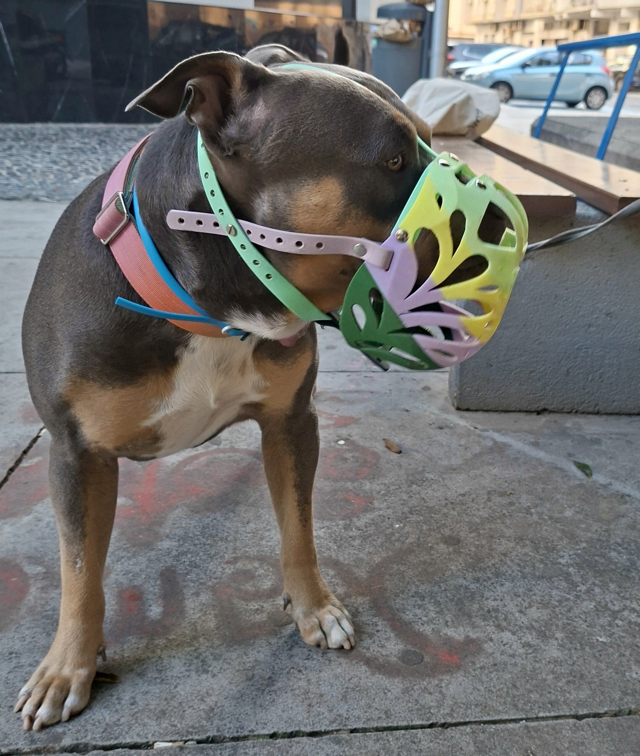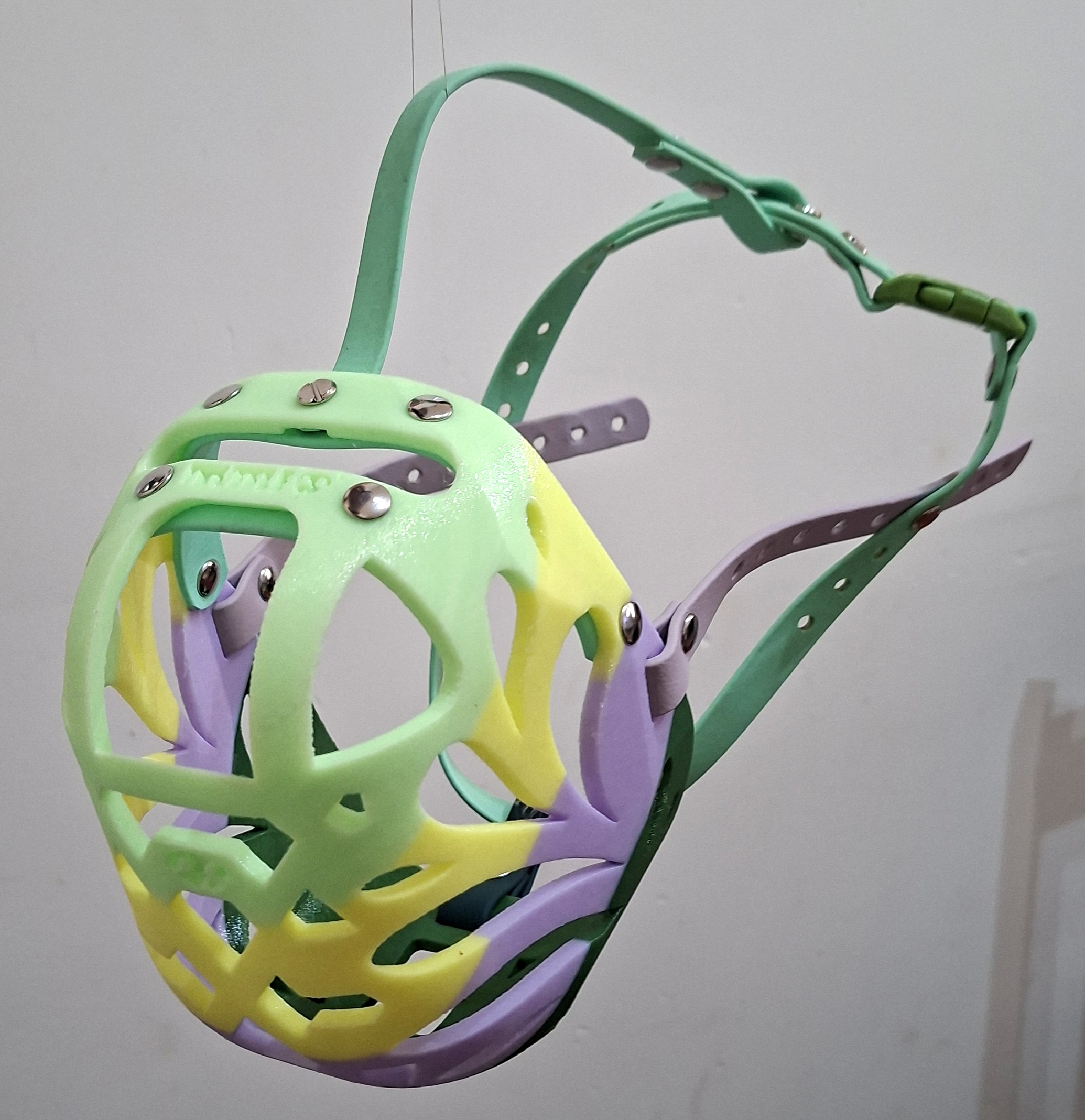 Multicolor Custom made TPU muzzle. It can be totally customized, from the quantity of strap colors (choice among 40 colors), to the type of closure (3 choices with 5 variations) and choice of hardware, 2 different colors, all hypoallergenic and nickel free or in stainless steel for dogs with sensitive skin or who do a lot of sport or outdoor, in any case, hardware touching the skin is only stainless steel to avoid allergies.