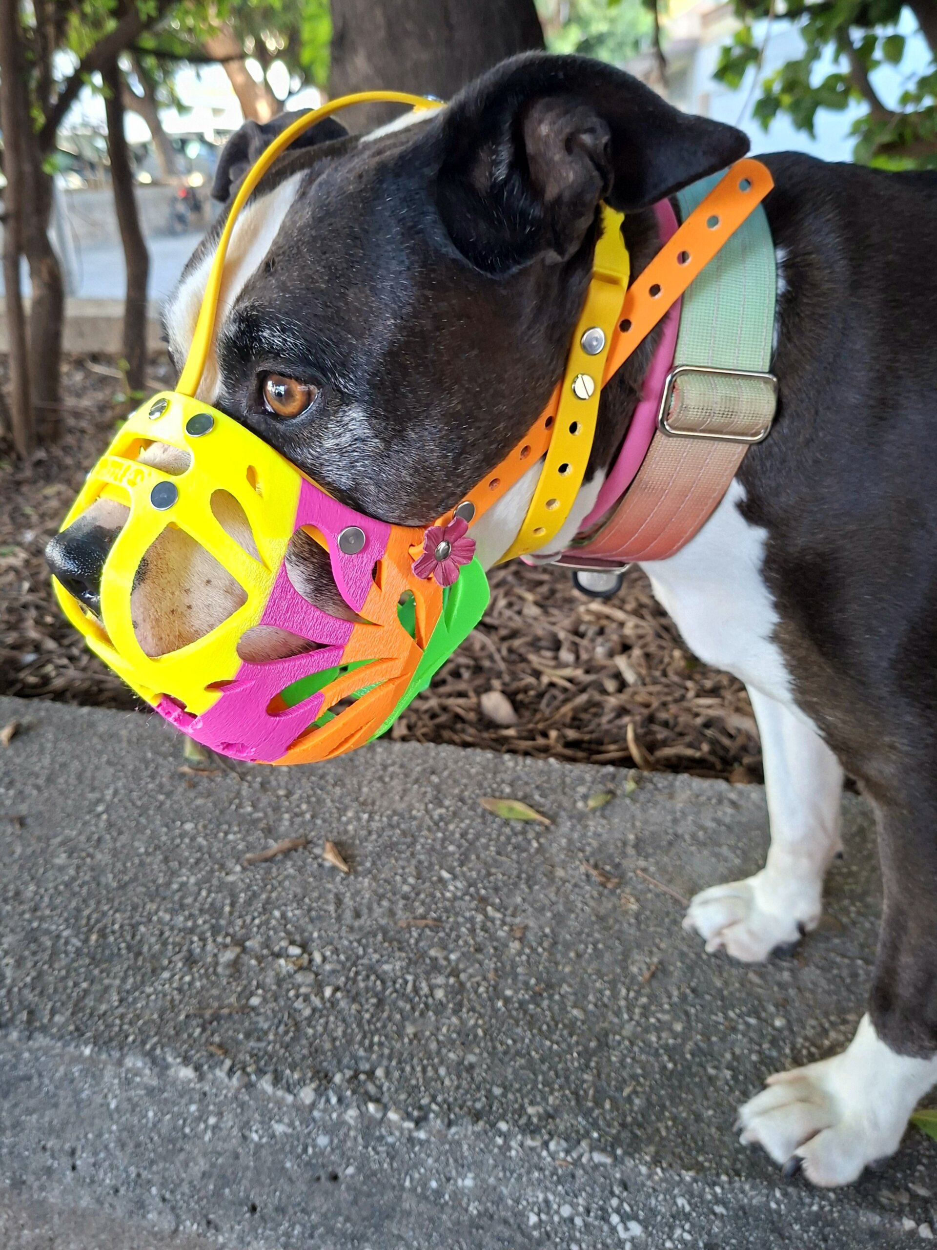 Multicolor Custom made TPU muzzle. It can be totally customized, from the quantity of strap colors (choice among 40 colors), to the type of closure (3 choices with 5 variations) and choice of hardware, 2 different colors, all hypoallergenic and nickel free or in stainless steel for dogs with sensitive skin or who do a lot of sport or outdoor, in any case, hardware touching the skin is only stainless steel to avoid allergies.